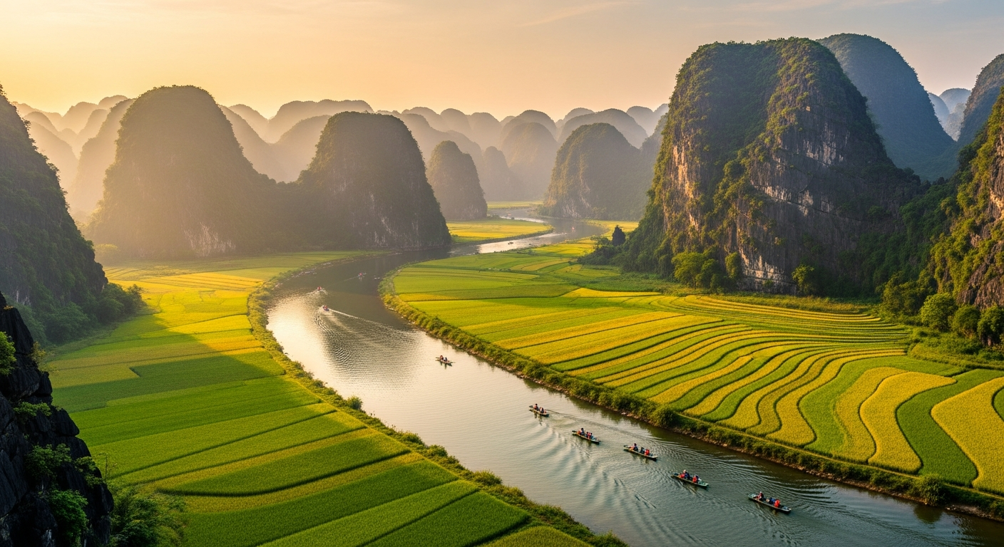 Experimente la majestuosa 'Bahía de Halong terrestre', donde imponentes formaciones cársticas se encuentran con arrozales color esmeralda e historia milenaria.